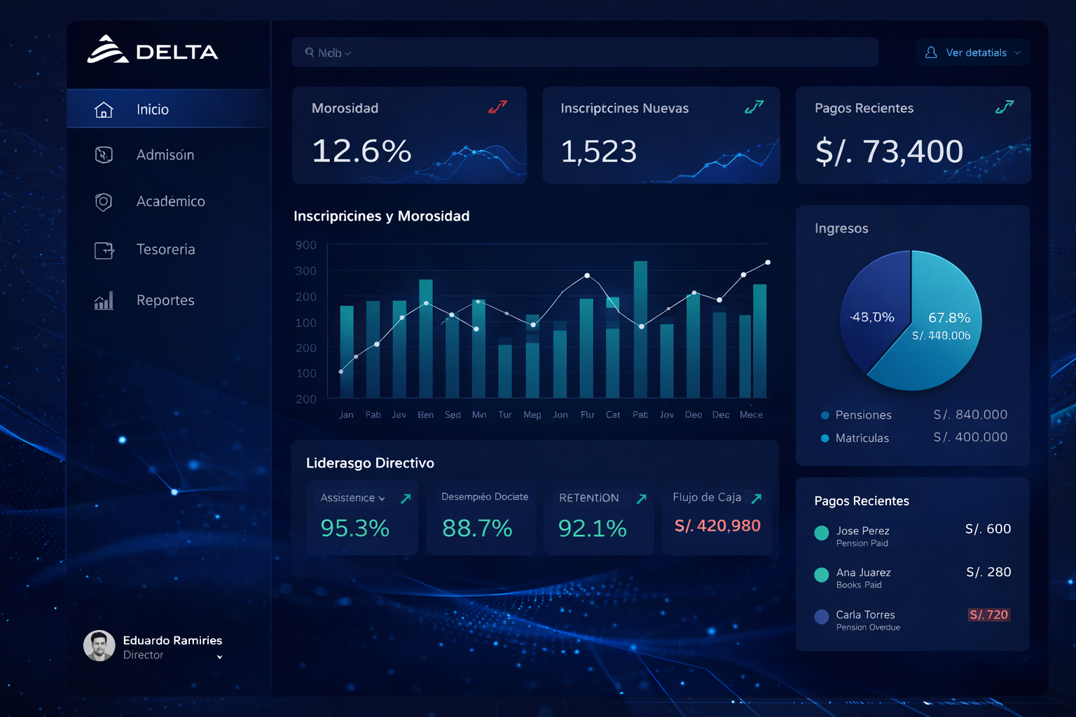 Controla matrícula, finanzas y rendimiento académico desde un solo lugar con inteligencia basada en datos.